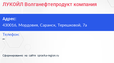 ЛУКОЙЛ-Волганефтепродукт, компания по адресу 430016, Мордовия, Саранск, Терешковой, 7а в дальнейшем Организация, размещена в следующих категориях:
