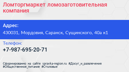 Ломторгмаркет, ломозаготовительная компания по адресу 430031, Мордовия, Саранск, Сущинского, 40а к1 в дальнейшем Организация, размещена в следующих категориях:
