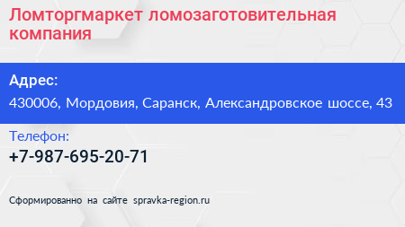 Ломторгмаркет, ломозаготовительная компания по адресу 430006, Мордовия, Саранск, Александровское шоссе, 43 в дальнейшем Организация, размещена в следующих категориях: