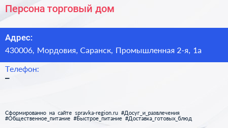 Персона, торговый дом по адресу 430006, Мордовия, Саранск, Промышленная 2-я, 1а в дальнейшем Организация, размещена в следующих категориях: