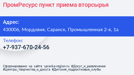 ПромРесурс, пункт приема вторсырья по адресу 430006, Мордовия, Саранск, Промышленная 2-я, 1а в дальнейшем Организация, размещена в следующих категориях:
