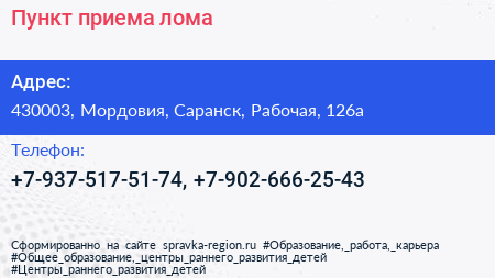 Пункт приема лома по адресу 430003, Мордовия, Саранск, Рабочая, 126а в дальнейшем Организация, размещена в следующих категориях: