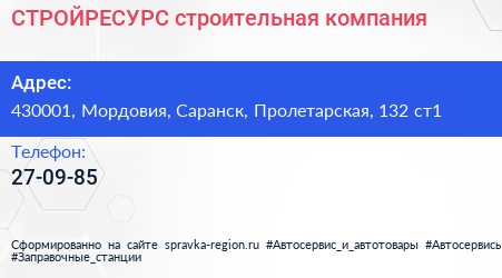 СТРОЙРЕСУРС, строительная компания по адресу 430001, Мордовия, Саранск, Пролетарская, 132 ст1 в дальнейшем Организация, размещена в следующих категориях: