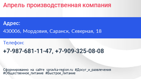 Апрель, производственная компания по адресу 430006, Мордовия, Саранск, Северная, 18 в дальнейшем Организация, размещена в следующих категориях: