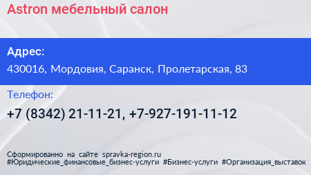 Astron, мебельный салон по адресу 430016, Мордовия, Саранск, Пролетарская, 83 в дальнейшем Организация, размещена в следующих категориях: