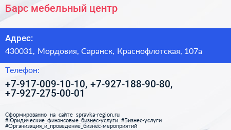 Барс, мебельный центр по адресу 430031, Мордовия, Саранск, Краснофлотская, 107а в дальнейшем Организация, размещена в следующих категориях: