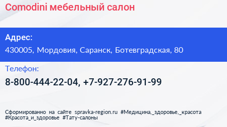 Comodini, мебельный салон по адресу 430005, Мордовия, Саранск, Ботевградская, 80 в дальнейшем Организация, размещена в следующих категориях: