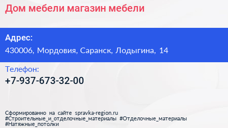 Дом мебели, магазин мебели по адресу 430006, Мордовия, Саранск, Лодыгина, 14 в дальнейшем Организация, размещена в следующих категориях: