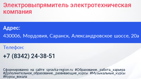 Электровыпрямитель, электротехническая компания по адресу 430006, Мордовия, Саранск, Александровское шоссе, 20а в дальнейшем Организация, размещена в следующих категориях: