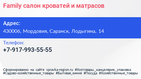 Family, салон кроватей и матрасов по адресу 430006, Мордовия, Саранск, Лодыгина, 14 в дальнейшем Организация, размещена в следующих категориях: