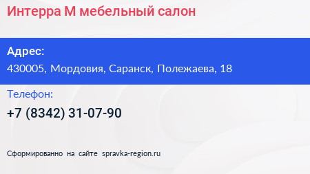 Интерра-М, мебельный салон по адресу 430005, Мордовия, Саранск, Полежаева, 18 в дальнейшем Организация, размещена в следующих категориях:
