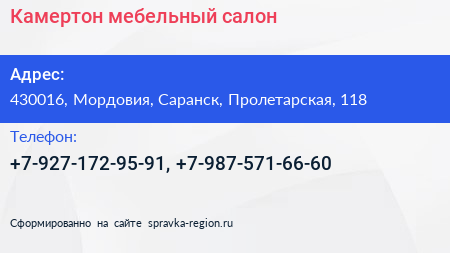 Камертон, мебельный салон по адресу 430016, Мордовия, Саранск, Пролетарская, 118 в дальнейшем Организация, размещена в следующих категориях: