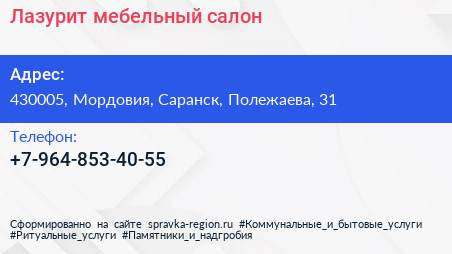 Лазурит, мебельный салон по адресу 430005, Мордовия, Саранск, Полежаева, 31 в дальнейшем Организация, размещена в следующих категориях: