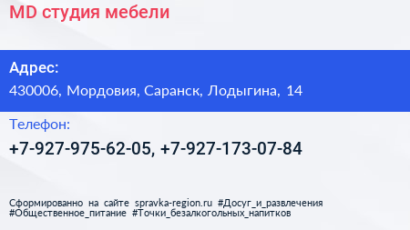 MD, студия мебели по адресу 430006, Мордовия, Саранск, Лодыгина, 14 в дальнейшем Организация, размещена в следующих категориях: