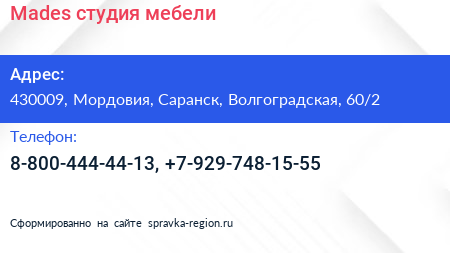 Mades, студия мебели по адресу 430009, Мордовия, Саранск, Волгоградская, 60/2 в дальнейшем Организация, размещена в следующих категориях: