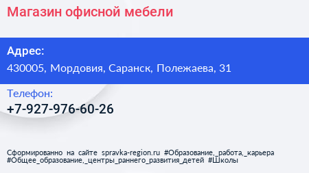 Магазин офисной мебели по адресу 430005, Мордовия, Саранск, Полежаева, 31 в дальнейшем Организация, размещена в следующих категориях: