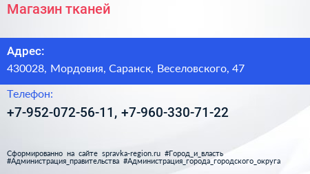 Магазин тканей по адресу 430028, Мордовия, Саранск, Веселовского, 47 в дальнейшем Организация, размещена в следующих категориях: