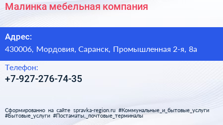 Малинка, мебельная компания по адресу 430006, Мордовия, Саранск, Промышленная 2-я, 8а в дальнейшем Организация, размещена в следующих категориях: