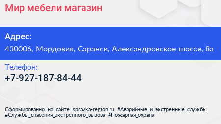 Мир мебели, магазин по адресу 430006, Мордовия, Саранск, Александровское шоссе, 8а в дальнейшем Организация, размещена в следующих категориях: