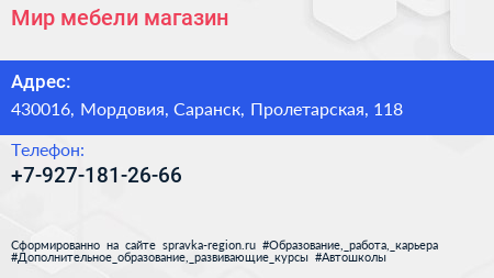 Мир мебели, магазин по адресу 430016, Мордовия, Саранск, Пролетарская, 118 в дальнейшем Организация, размещена в следующих категориях:
