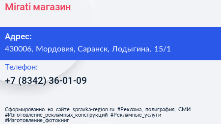 Mirati, магазин по адресу 430006, Мордовия, Саранск, Лодыгина, 15/1 в дальнейшем Организация, размещена в следующих категориях: