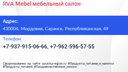 RVA Mebel, мебельный салон по адресу 430004, Мордовия, Саранск, Республиканская, 49 в дальнейшем Организация, размещена в следующих категориях: