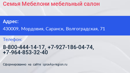 Семья Мебелони, мебельный салон по адресу 430009, Мордовия, Саранск, Волгоградская, 71 в дальнейшем Организация, размещена в следующих категориях: