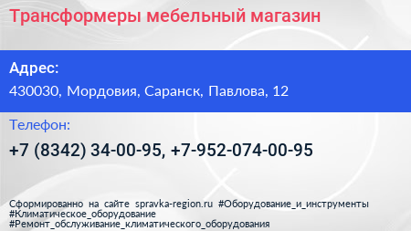 Трансформеры, мебельный магазин по адресу 430030, Мордовия, Саранск, Павлова, 12 в дальнейшем Организация, размещена в следующих категориях:
