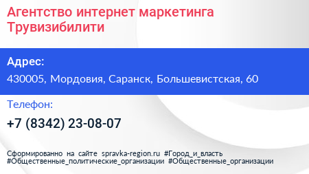Агентство интернет маркетинга Трувизибилити по адресу 430005, Мордовия, Саранск, Большевистская, 60 в дальнейшем Организация, размещена в следующих категориях: