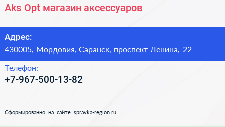 Aks-Opt, магазин аксессуаров по адресу 430005, Мордовия, Саранск, проспект Ленина, 22 в дальнейшем Организация, размещена в следующих категориях:
