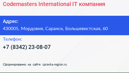 Codemasters International, IT-компания по адресу 430005, Мордовия, Саранск, Большевистская, 60 в дальнейшем Организация, размещена в следующих категориях: