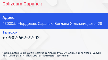 Colizeum Саранск по адресу 430005, Мордовия, Саранск, Богдана Хмельницкого, 28 в дальнейшем Организация, размещена в следующих категориях: