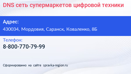 DNS, сеть супермаркетов цифровой техники по адресу 430034, Мордовия, Саранск, Коваленко, 8Б в дальнейшем Организация, размещена в следующих категориях: