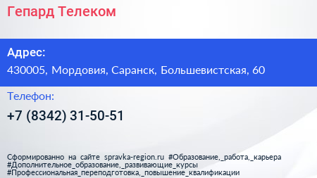 Гепард Телеком по адресу 430005, Мордовия, Саранск, Большевистская, 60 в дальнейшем Организация, размещена в следующих категориях: