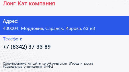Лонг Кэт, компания по адресу 430004, Мордовия, Саранск, Кирова, 63 к3 в дальнейшем Организация, размещена в следующих категориях:
