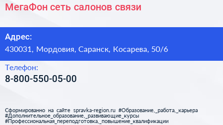 МегаФон, сеть салонов связи по адресу 430031, Мордовия, Саранск, Косарева, 50/6 в дальнейшем Организация, размещена в следующих категориях: