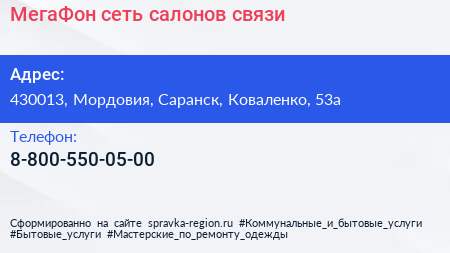 МегаФон, сеть салонов связи по адресу 430013, Мордовия, Саранск, Коваленко, 53а в дальнейшем Организация, размещена в следующих категориях: