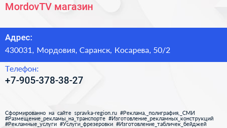 MordovTV, магазин по адресу 430031, Мордовия, Саранск, Косарева, 50/2 в дальнейшем Организация, размещена в следующих категориях: