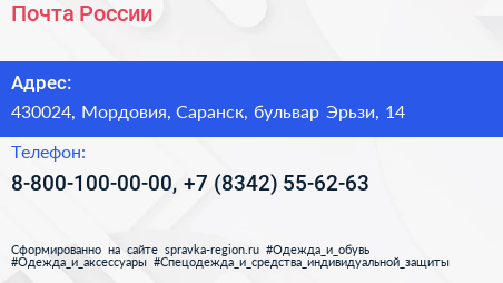 Почта России по адресу 430024, Мордовия, Саранск, бульвар Эрьзи, 14 в дальнейшем Организация, размещена в следующих категориях: