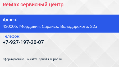ReMax, сервисный центр по адресу 430005, Мордовия, Саранск, Володарского, 22а в дальнейшем Организация, размещена в следующих категориях: