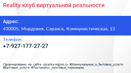 Reality, клуб виртуальной реальности по адресу 430005, Мордовия, Саранск, Коммунистическая, 13 в дальнейшем Организация, размещена в следующих категориях: