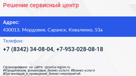 Решение, сервисный центр по адресу 430013, Мордовия, Саранск, Коваленко, 53а в дальнейшем Организация, размещена в следующих категориях: