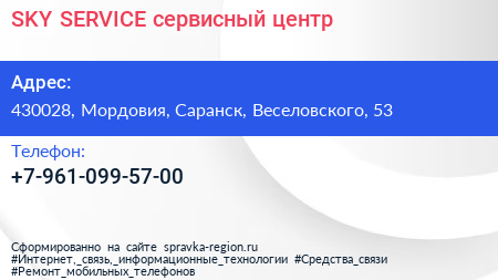 SKY SERVICE, сервисный центр по адресу 430028, Мордовия, Саранск, Веселовского, 53 в дальнейшем Организация, размещена в следующих категориях: