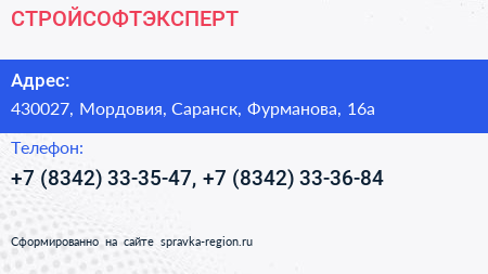 СТРОЙСОФТЭКСПЕРТ по адресу 430027, Мордовия, Саранск, Фурманова, 16а в дальнейшем Организация, размещена в следующих категориях: