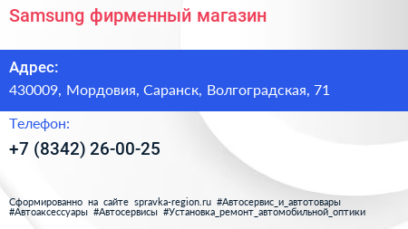 Samsung, фирменный магазин по адресу 430009, Мордовия, Саранск, Волгоградская, 71 в дальнейшем Организация, размещена в следующих категориях: