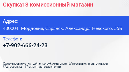 Скупка13, комиссионный магазин по адресу 430004, Мордовия, Саранск, Александра Невского, 55Б в дальнейшем Организация, размещена в следующих категориях: