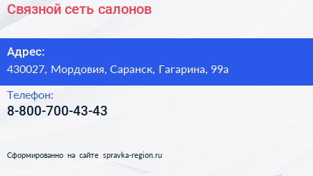 Связной, сеть салонов по адресу 430027, Мордовия, Саранск, Гагарина, 99а в дальнейшем Организация, размещена в следующих категориях:
