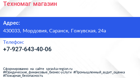 Техномаг, магазин по адресу 430033, Мордовия, Саранск, Гожувская, 24а в дальнейшем Организация, размещена в следующих категориях: