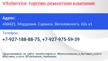 VitoService, торгово-ремонтная компания по адресу 430421, Мордовия, Саранск, Веселовского, 62а к1 в дальнейшем Организация, размещена в следующих категориях: