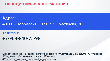 Господин музыкант, магазин по адресу 430005, Мордовия, Саранск, Полежаева, 30 в дальнейшем Организация, размещена в следующих категориях: